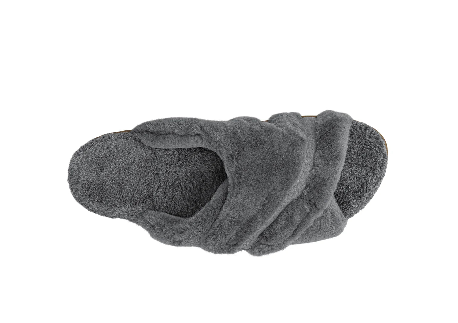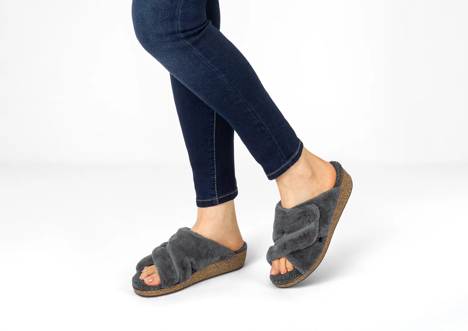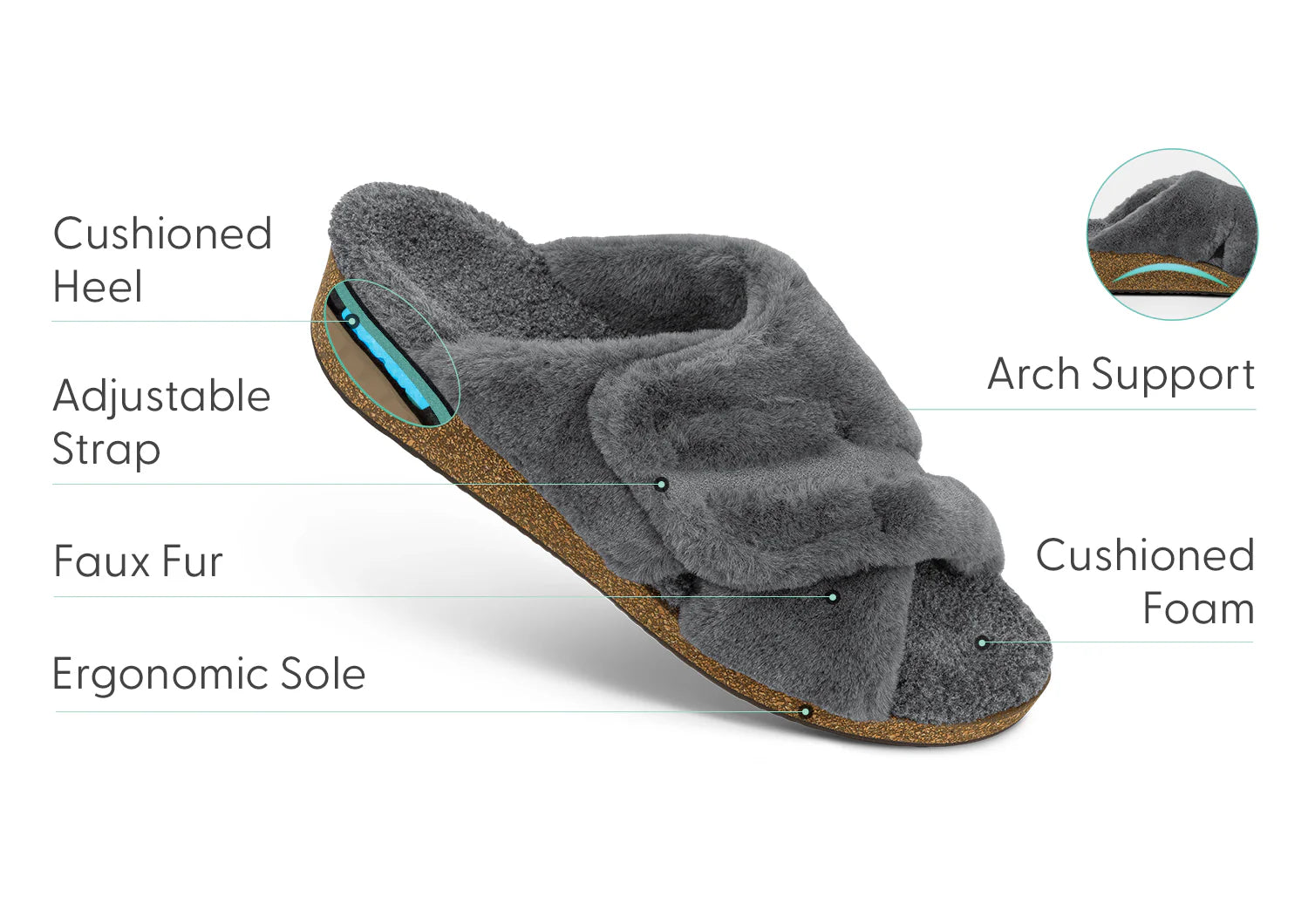 Celine transforms your daily comfort routine with its irresistibly soft faux fur that gently embraces your feet in cozy luxury. The stylish criss-cross straps feature hidden hook-and-loop adjustability, letting you customize the fit to perfection while adding a touch of elegance to your loungewear. The plush footbed lining and cork-inspired sole provide gentle support whether you're padding around the house or stepping out to grab the mail. With Celine, every step is a moment of pure indulgence – because you deserve to feel pampered from morning coffee to bedtime.