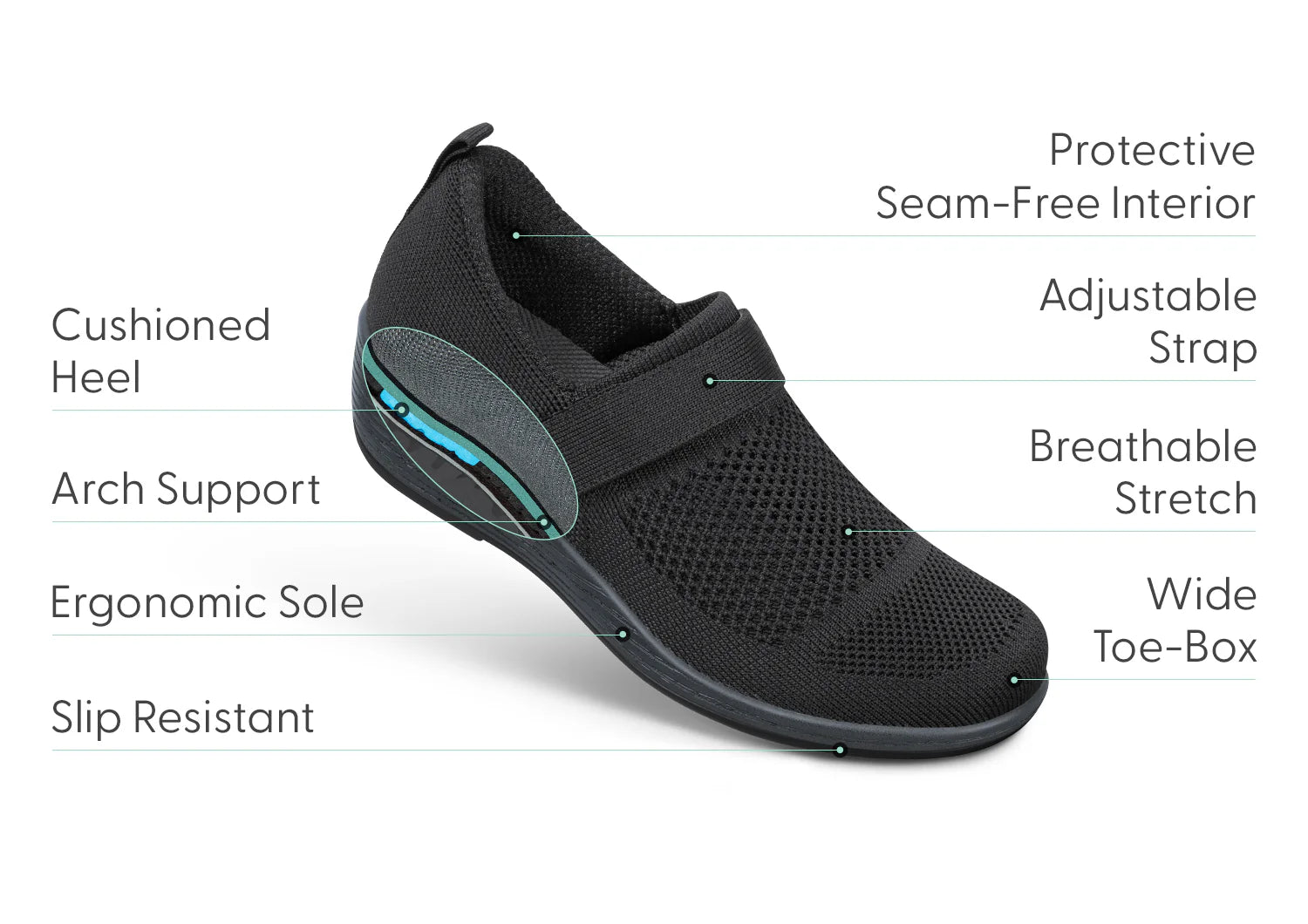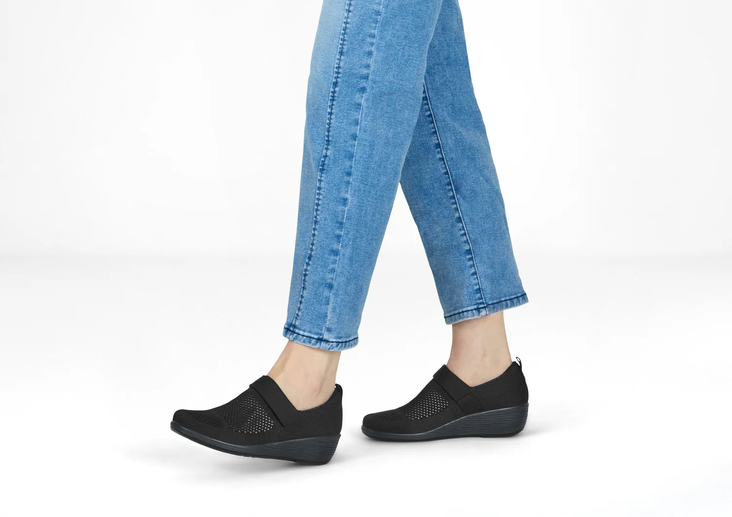 Eve’s innovative wedge heel elevates your style with healthy comfort that feels more like a sneaker! Let the impeccable crochet-weave stretch upper, adjustable strap and soft interior wrap your feet in protective, custom fit luxury. Advanced cushioning, an easy-walking sole and anatomical arch support reduce impact from every step, all the way up to the lower back.