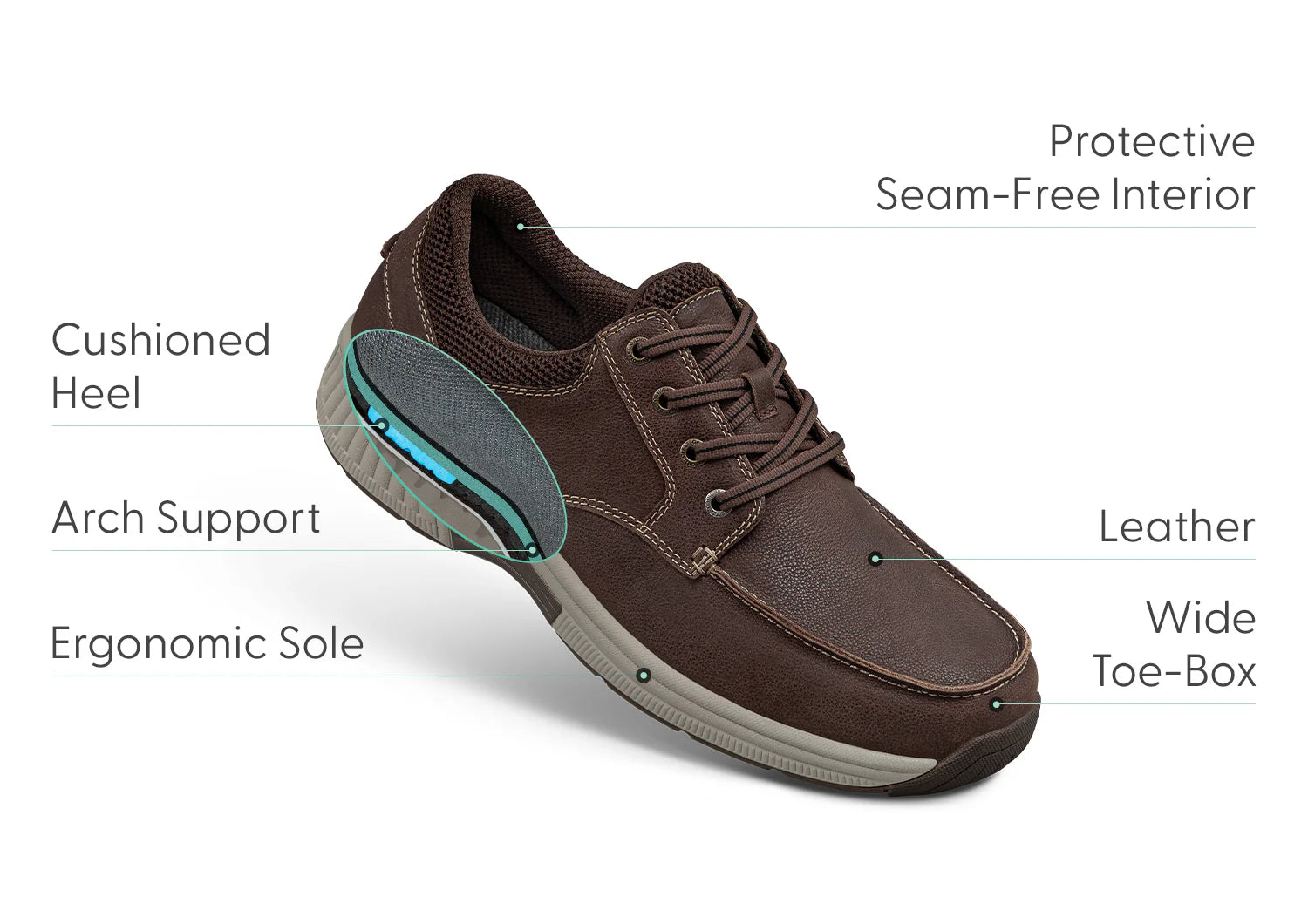 With knockabout good looks and a durable, flexible leather upper, Leo defends your walking comfort everywhere you go. A roomy, padded interior with adjustable depth and anatomical arch support provides customizable, irritation-free support. The cushioned Ortho-Cushion™ System insole, mild rocker design, and high-traction outsole take pressure off pain points and stabilize every step.