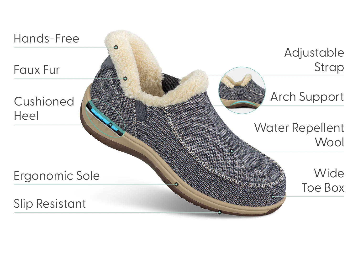 Saunter indoors and venture out in the luxurious comfort of these wool slipper-shoes. No need to bend down, our revolutionary hands-free technology makes it easy to slide them on and get going. Lined with cozy faux fur, Lorin keeps feet warm and free of irritation for pain-free hours anywhere, featuring the walking support of the Ortho-Cushion™ System to soften every step.