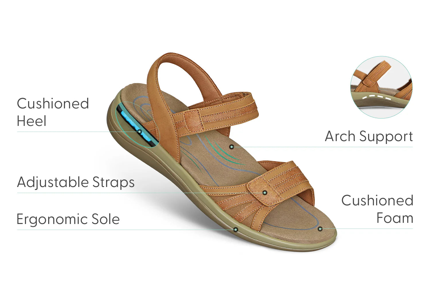 Step into beautifully detailed leather and premium all-day comfort. The fully adjustable front strap opens completely, and the adjustable inset strap opens with a tab, making it a breeze to get these on and off. Enjoy a secure, personal fit with clever design features that avoid bone pressure and sensitive areas, and customizable Ortho-Cushion™ System support for everywhere you go.