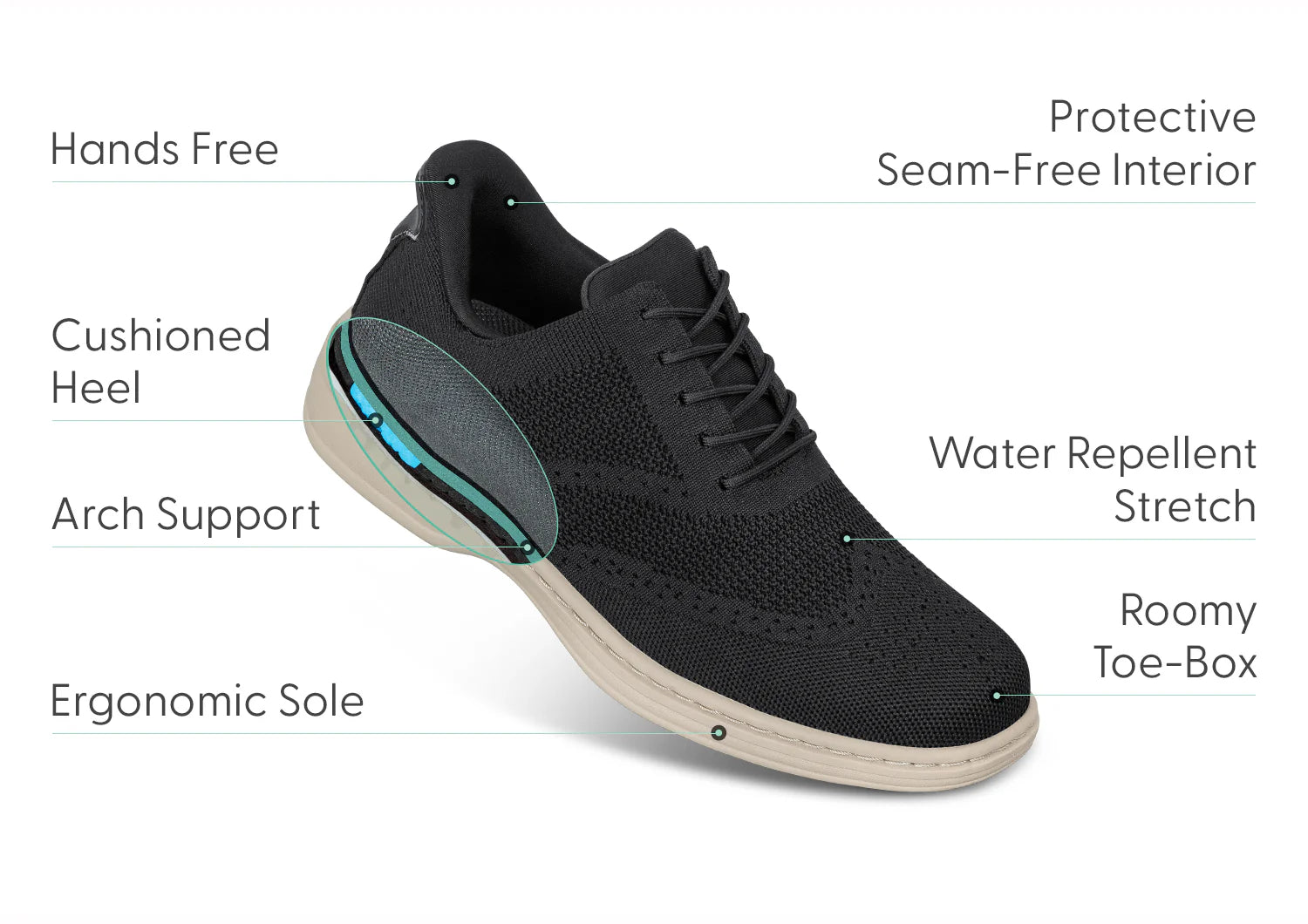 Elegant wingtip styling meets patented hands-free technology and a breathable, stretchable knit fabric upper for lightweight good...