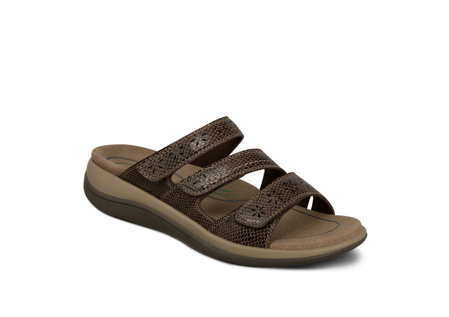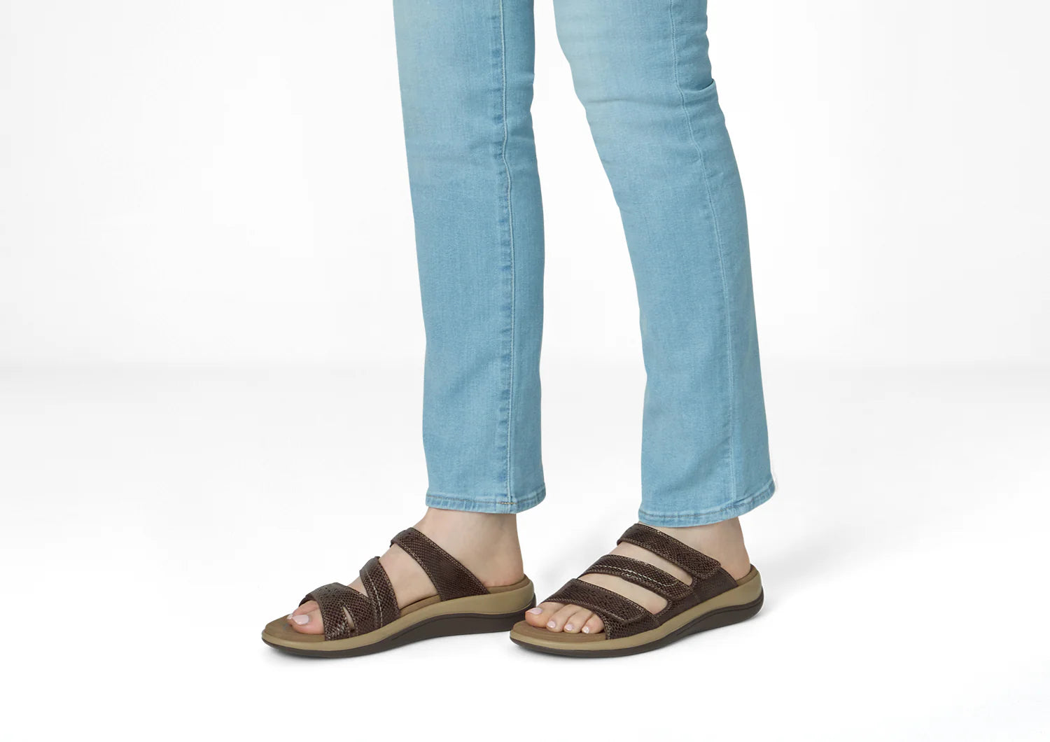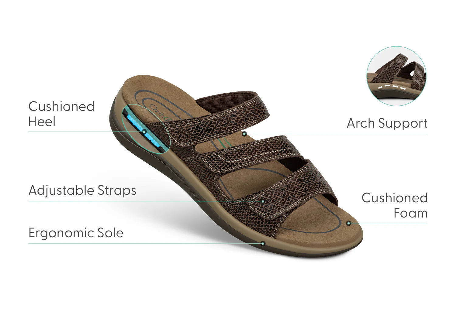 Every comfy strap on our pretty three-strap slide completely opens for true "step-right-in" ease and adjustability that forms to every curve and bump of your foot. Orthofeet's innovative comfort engineering makes going out pain-free, with a foot-hugging fit that keeps you happily in your sandals, not sliding out, for carefree fun under the sun.